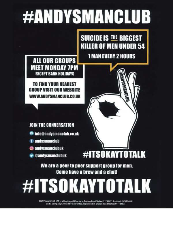 " ANDYSMANCLUB are a men’s suicide prevention charity, offering free to attend peer-to-peer support groups across the United Kingdom and online. We want to end the stigma surrounding men’s mental health and help men through the power of conversation. #ITSOKAYTOTALK "